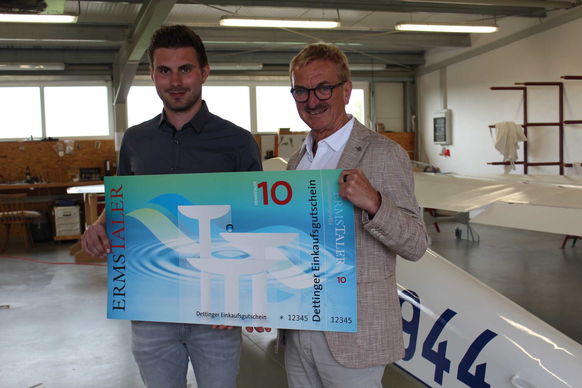 Der Vorsitzende des Gewerbevereins Dettingen, Dr. Rolf Hägele erteilte in der Metzinger Fliegerwerkstatt dem 2. Vorsitzenden des Luftsportvereins, Benjamin Handel, die offizielle „Startfreigabe“ zur Annahme des „ErmsTalers“.