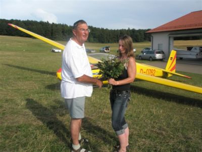 Nachdem Fabian Helms und Achim Kuhn bereits im Sommerlager in Kamenz ihren ersten Alleinflug absovierten und per Klaps auf den Po eingenordet wurden, hat auch Martina Häubel am Sonntag (16.08.) auf dem Roßfeld Ihre 3 Platzrunden ohne Fluglehrer gedreht. . |