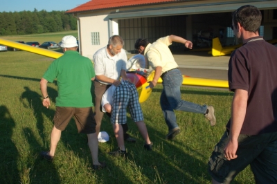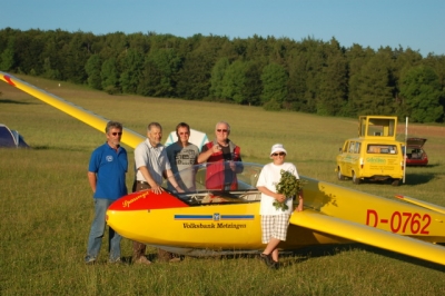 Am Samstag den 13.06.09 durfte auch Max Wörner das erste mal alleine fliegen. Die drei Starts und Landungen absolvierte er souverän. ![]() Mama Sandra fiebert mit! ![]() Von links: Fluglehrer Reiner Gaa, Peter Sautter, Timo Kuhn und Dieter Gruschka. Noch grinst Max... ![]() Auch die obligatorische Eichung des Popometers überstand Max, so dass jetzt auch längeren Thermikflügen nichts im Weg steht. |