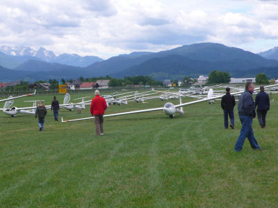 Lesce-Bled. Die 18. Slowenischen Segelflugmeisterschaften wurden in Lesce-Bled ausgetragen. An vier Wertungstagen wurden die Meister und Platzierten ermittelt. Die Wetterbe-dingungen waren sehr unhomogen und verlangten von den Piloten ihr ganzes Können ab. Neben dem klassischen Thermikfliegen war auch das Hang- und Wellenfliegen für schnelle und erfolgreiche Wertungsflüge erforderlich. Die zu fliegenden Tagesaufgaben erstreckten sich auf die Karawanken, Julischen Alpen und Lienzer Dolomiten. ![]() Startaufstellung, erkennbar die schwierigen Wetterbedingungen |