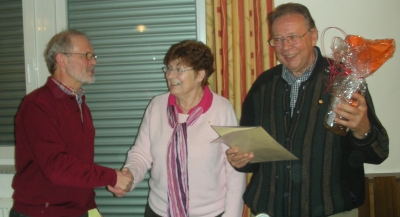 (v.l.n.r) Eberhard Wezel, Sigrun Handel, Bruno Handel Jugendleiter Jürgen Schellig betreut eine Gruppe von 14 Jugendlichen mit 12 Jungs und zwei Mädchen. Gemeinsam mit der Fliegergruppe Hülben veranstaltete man ein Pfingstlager auf dem Roßfeld. Etwas ganz besonderes war das Silvesterfliegen im Winterlager auf dem Rossfeld . Die Jugendgruppe hat Dank Daniel Müller und Christian Glass jetzt eine eigene Seite auf der Homepage des LSV-Rossfeld (www.lsv-rossfeld.de). Die Kasse wurde in diesem Jahr von Klaus Dost und Roland Feucht geprüft und wie immer ohne Beanstandungen angetroffen. Norbert Fehrle beantragte die Entlastung von Vorstand und Finanzverwalter, die auch einstimmig erteilt wurde. Ein besonderes Highlight ist es, wenn ein Ehepaar 65-jährige Mitgliedschaft in einem Verein feiern kann. Das gemeinsame Hobby von Sigrun und Bruno Handel war das Fliegen. Sigrun Handel wurde für 25-jährige Mitgliedschaft die silberne Ehrennadel ans Revers geheftet. Sie hatte für viele Jahre die Patenschaft über das Vereinsheim Kakadu übernommen. Bruno Handel ist seit 40 Jahren Mitglied im Verein und wurde mit der goldenen Ehrennadel ausgezeichnet.. Er war von 1968 bis 1990 mit einer kurzen Unterbrechung als Schriftführer tätig und hat sich immer für die gestalterischen Aufgaben berufen gefühlt. So stammt aus seiner Feder auch das offizielle Piktogramm des LSV Rossfeld. Mit dem Motorsegler in die Partnerstadt Noyon und mit dem Schreiber dieser Zeilen über Wien nach Slovenij Gradec seien nur zwei seiner vielen Flüge im In- und Ausland erwähnt. Zum Abschluss gab der Erste Vorsitzende eine Übersicht über die Planungen in der kommenden Saison. So wird es einen Theoriekurs für die Flugschüler in Metzingen geben, neue Windenfahrer werden ausgebildet und Timo Kuhn und Norbert Fehrle werden sich zum Lehrer für Ultraleichtflugzeuge ausbilden lassen. Am 30. April beim Maibaumstellen in Dettingen sowie am Metzinger Stadt- und Heimatfest und an den Ferienprogrammen von Dettingen und Metzingen wird der LSV Rossfeld wie bisher teilnehmen.